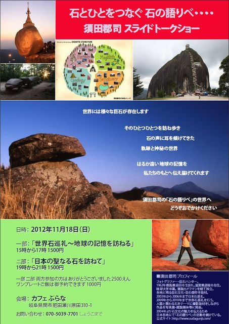 世界には様々な巨石が存在します そのひとつひとつを訪ね歩き 石の声に耳を傾けてきた 軌跡と神秘の世界 はるか遠い地球の記憶を 私たちのもとへ伝え届けてくれます 須田郡司の「石の語りべ」の世界へ どうぞおでかけください 日時:2012年11月18日(日) 一部:「世界石巡礼〜地球の記憶を訪ねる」 15時から17時 1500円 ニ部:「日本の聖なる石を訪ねて」 19時から21時 1500円 一部二部両方参加の方はありがとうございました2500 えん ワンプレートご飯は御予約できます 1000円