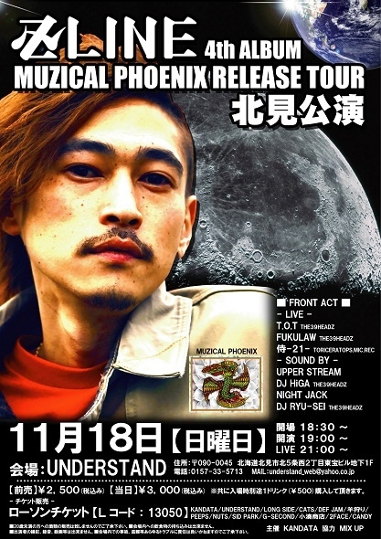 ただ今、絶好調の人気レゲエDee-Jayの 卍LINEの北海道クラブツアー開催決定 ■卍LINE 4th ALBUM MUZICAL PHOENIX RELEASE TOUR 2012.11.18(sun) OPEN 18:30 START 19:00 前売\2500- 当日\3000- @北見CLUB UNDERSTAND ローソンチケット(Lコード:13050) http://haon-reggae.com/ 卍LINE