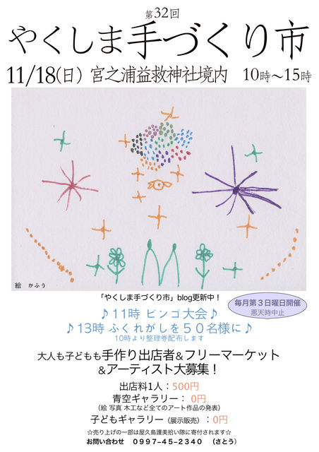 いつもいつもスペースありがとうございます! こんにちは。やくしま手づくり市の高田なおです。 日曜日は宮之浦益救神社にて手づくり市です。 出店者大募集! そして遊びに来て下さい。 楽しみにしています! 第32回やくしま手づくり市 日時:2012、11、18(日) 時間: 手作り市は10時から15時まで 場所:益救神社境内(宮之浦) 出店料:500円/一人 こどもギャラリー、青空ギャラリー(アート作品の展示のみ)は出店料無料。 ◎みなさまに感謝をこめて ふくれがしを50名様にプレゼン