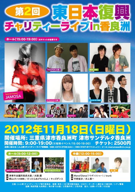 第2回 東日本復興チャリティーライブin香良州 2012年11月18日(日) 開催場所:三重県津市香良州町 津市サンデルタ香良州 開催時間:9:00〜19:00(※有料イベント ホール15:00〜19:00) チケット:2,500円 主催:(人と絆)チャリティーライブ実行委員会 後援:津市/(社)津市観光協会/日本モーターボート選手会 三重支部/シティ警備 協賛:海産問屋 丸政商店/海の家 なお屋/土性製作所/土性外装 協力:志摩レゲエ祭/KS企画