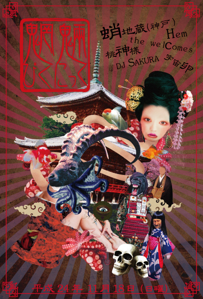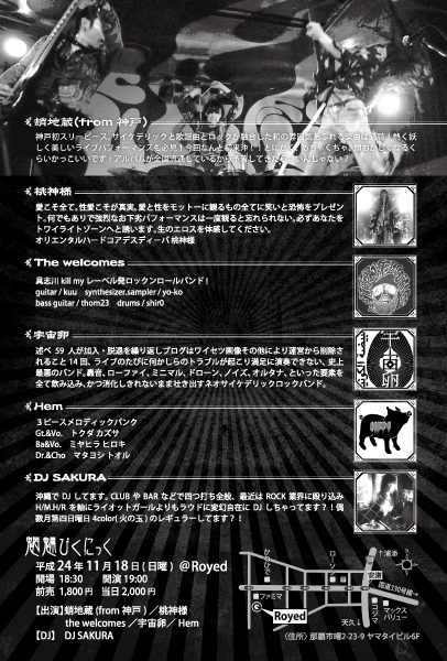 魍魎ぴくにっくvol.4 2012/11/18(日)@曙ROYD オープン18時30分 スタート19時 チケット前売り 1800円/当日 2000円+1D ●バンド 蛸地蔵(神戸) 桃神様 The welcomes 宇宙卵 hem ●DJ sakura 遠くの神戸からちょーかっこいい蛸地蔵さんがいらしてくださるよ☆ 1回ライブを見ただけですが、まじで沖縄の人々に観ていただきたい!! しに観ていただきたい!!! 今回ぼくはオープニングアクトを務めるよww みんなきてね☆ そして、素敵なフライヤーをふみんちゃんが作って下さったから届いたら配るの。 待っていてね♪
