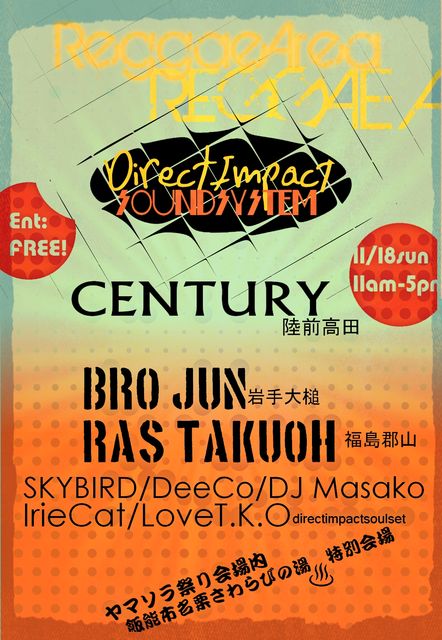 埼玉の飯能市のお祭りにて DIRECT IMPACT Sound System と 東北の復興支援 行ないます!! UNITY **************************** 飯能市名栗さわらびの湯ー山空祭り− 今年も名栗地域の文化祭り開催。 今年はレゲエエリアが出現します! もちろん!レゲエナ僕らの復興支援!チャリティーブースも出ます。 東北のサウンドを聞きに行こう! 11月18日山空祭り〜レゲエエリア AM11時〜17時ごろまで 入場無料 SpecialGuest: CENTURY