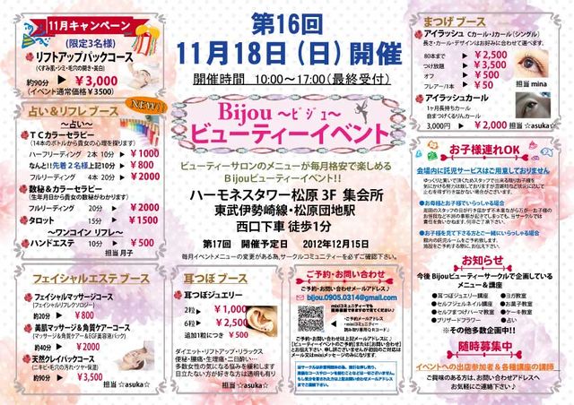 こんにちは Bijou〜ビジュ〜 ビューティーサークル 管理人☆asuka☆です 〜お知らせ〜 11月のイベントは開催会場が変わります 皆様、お間違いのない様お気を付け下さいね では、お待ちかねのイベント詳細をアップします 今月のビューティーイベント、NEWブースは占い&リフレで〜す 一足先に私が体験したTCカラーセラピーと数秘は 14本の可愛らしいカラーボトルと生年月日から心理を占って貰いました 興味深い結果にすっかりハマりそう と