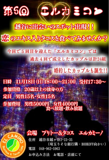 貴重なスペースお借りします。 越谷駅前メキシカンのエルカミーノです。 「越谷に出会いのスポット出現!!恋のエキス入りタコスを食べてみません か!!!」 「過去4回でカップルが24組成立しました。婚約者も誕生しました!」 皆様、お待たせしました!第5回エルカミコンの日程が決まりました! 日時11月18日(日)18時〜21時 (受付17:30) 参加費用 男性5000円 女性4000円 参加条件 20歳以上の独身の方 定員 男性15名 女性15名 飲み放題