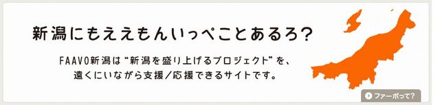 ***************************** 管理人様、副管理人様、貴重なスペースを誠にありがとうございます ***************************** 新潟県で友達を作ろうの会 ご参加者の皆様 はじめまして。 地元応援クラウドファンディングFAAVOと申します。 唐突で非常に恐縮ではございますが この度、私どもFAAVOは、新潟の地域活性化を企む個人・団体を広く 応援することの出来るウェブサイト『FAAVO新潟』をオープンいたしました。 ぜひ、新潟にて活動を行う人々のことをよりよく