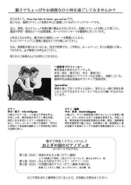 今年も親子向けの無料のバリアフリー・クラシックコンサートを開催いたします!! 家族でみんなで仲良く、ちょっぴりお洒落なひと時を過ごしてみませんか? お申込みは、ホームページより受け付けしております。 Y&Mホームページ:http://yandmpiano.web.fc2.com/ なお、座席数が限られているため、予約制となっております。 参加ご希望の際は必ず事前にご予約ください。 皆さまのご来場、心よりお待ちしております!! ☆。。☆。。☆。。☆。。☆。。☆。。☆。。 Piano Duo  Yoko & Mami -you and me- 親子で仲良