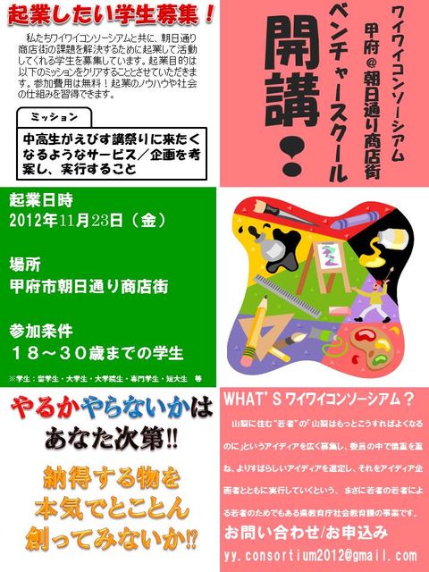 こんにちは! 私が所属しているワイワイコンソーシアム(※)の企画をご案内します。 突然ですが、 地域の/商店街のお祭りに、何かが足りない… こういうサービスがあったらいいな… なんて考えたことはないでしょうか? 「この前たまたまやっていたお祭りに参加したけど、 小さい時に楽しかったお祭りの記憶と何か違う…」 「イベント大好き!何か自分で企画したい!!」 どんな理由であれ、ここまで読んで下さったあなたは もうすでにこの企画に興味をお持ちではないでしょうか!? ワイワイコンソーシアムでは、