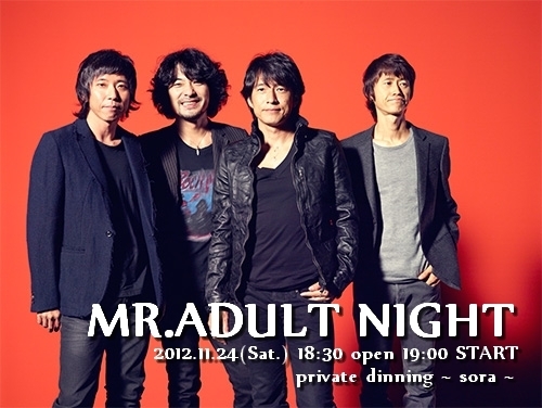 ※ 一旦、キャンセル待ちも締め切っております ※ MR.ADULT NIGHT借り致します。 各地でカラオケや飲みオフイベントが開催されておりますが、私も開催させて頂きたいと思います。 オフの趣旨につきましては後述致しますので、ご熟読お願い致します。 【 日 時 】2012年11月24日(土) 18:30(受付)19:00開始(およそ3時間予定) 【 会 場 】個室ダイニング そら 〜 sora 〜 最寄駅:梅田 (http://r.gnavi.co.jp/k389507/) 【 道 順 】http://mixi.jp/view_diary.pl?id=1876710762&owner_id=34184515 【 料 金 】4500円(マイ箸割がありま
