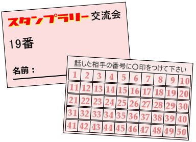 交流100%を目指した「スタンプラリー交流会」のお知らせです 100人集まる飲み会や、1000人集まる街コンに参加しても結局話せるのってせいぜい10人ぐらいじゃないですか もったいない それならスタンプラリー交流会に遊びに来てください この交流会ではみなさんにスタンプ台紙をお渡しし、話した相手の番号を1人1人チェックしていきます 前半はスタッフがみなさんを誘導し、少人数のグループで人見知りの方でも話しやすい環境を作ります 20分毎に4回メンバーチェンジを行なっ