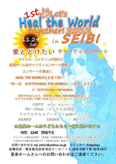 マイケルが訪れた星美ホームで「HEAL THE WORLD」を世界中のみんなで歌いましょう! 歌は自信が・・・という方も とりあえず見てるだけにしたい・・・ という方も大丈夫! どなたでも 大歓迎です マイケルが訪れた場所でマイケルの愛とHeal the Worldを 一緒に伝えていきましょう♪ 当日コンサート会場で練習時間をとりみんなで練習してから歌います 初めてヒルザワを歌う方もお気軽にご参加ください ! 記念すべき1st世界同時ヒルザワ ぜひご参加お待ちしています!