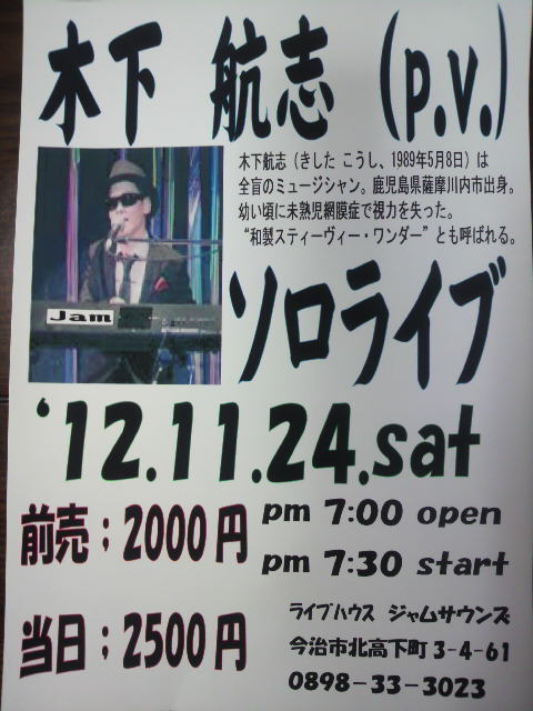全盲の ミュージシャン 【 木下航志 】 ピアノ&ボーカル ソロライブ 和製スティービーワンダー 2012年11月24日 PM 7時 オープン PM 7時30分 スタート チケット 前売 2000円 当日 2500円 ライヴハウス ジャムサウンズ 今治市北高下町3ー4ー61 (ゲオ 近く) (徳丸皮膚科 向かい側) 問合せ 0898-33-3023