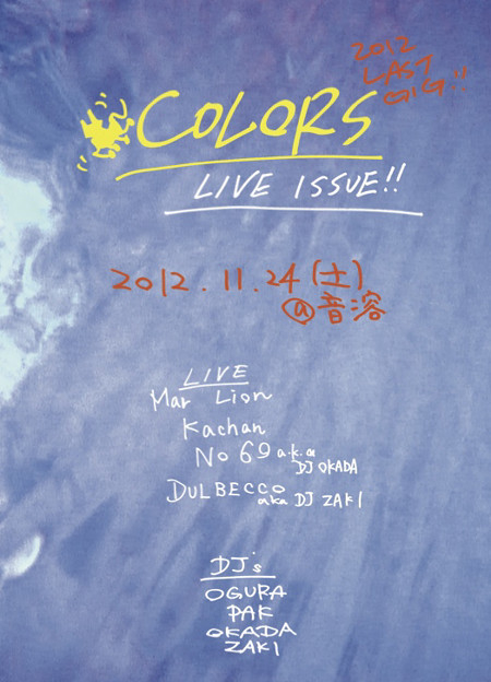 COLORS LIVE ISSUE 2012.11.24 (sat) at 音溶 22:00 start 1,500yen (w1d) LIVE: DULBECCO aka DJ ZAKI NO69 aka DJ OKADA kachan Mar-Lion DJs: ZAKI OKADA OGURA PAK ■Party Info http://www.oto-doke.com/schedule/s_news.cgi#224 (PC) http://photozou.jp/photo/show/703820/160062950 (携帯) ■音溶 愛媛県松山市三番町二丁目10-9第3クリーンビル3F ★WEB http://www.oto-doke.com/ ★BLOG http://www.oto-doke.com/blog/sfs4_diary/ ★facebook http://www.facebook.com/pages/%E9%9F%B3%E6%BA%B6/1529