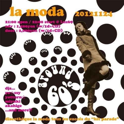 11月の『la moda』は第4土曜、11/24に開催です! 今回は60'sをテーマに、音楽はもちろん、 デコレーションやファッションも60'sテイストでお送りします! レトロポップ&ロックな夜を粋に楽しみましょう! コンピCDも久しぶりに配布予定で〜す! 普通に60'sコンピを作ってもアレなんで、 年代&ジャンル問わず、ビートルズのカバーを 集めたコンピCDを作ろうと思います。 ちょっとおもしろいかもー。 ということで、みなさん遊びに来て下さい! 『la moda 20121124 - around 60's!!』 on:2012.11.24 (Sat.) 21:0