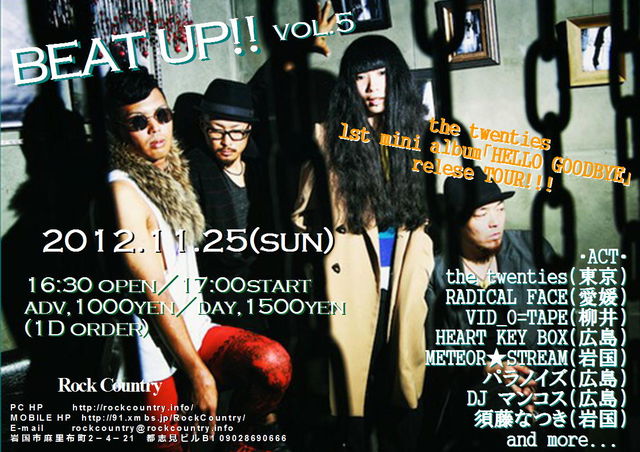 BEAT UP vol.5 【the twenties 1st mini album「HELLO GOODBYE」リリースツアー】 11/25(日) 16:30open 17:00start 前売\1000 当日\1500 (共に1dオーダー) ●出演者 ☆the twenties(東京) ☆RADICAL FACE(愛媛) ☆HEART KEY BOX(広島) ☆VID_O=TAPE(柳井) ☆METEOR★STREAM(岩国) ☆パラノイズ(広島) ☆DJ マンコス(広島) ☆須藤なつき(岩国)