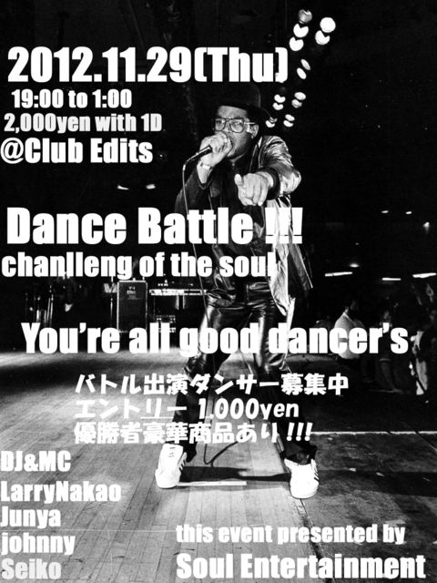 ダンスバトルの 内容は1vs1のトーナメント方式 判定はお客さんの旗の数です 皆さんに青と赤の旗を渡しますので 上手いと思ったダンサーの 色の旗をあげて下さい 旗の数で勝敗を決めます その場にいる多くの方の心を掴む ダンスパフォーマンスを行った ダンサーがトーナメントを勝ち抜き 優勝するという方式です 今回、賞品大会となりますので 出演ダンサーもエントリー料金 1,000yen頂きます 2012.11.29(Thu) 19:00 - 1:00 charge 2,000yen wih 1D DJ / MC Larr