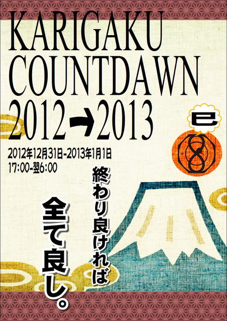 今年も年の瀬。。。 大晦日は皆さんどんな感じですごされるんでしょう? 実家に帰られる方もいれば、仕事の方もいるでしょうし 恋人とまったりやお友達とワイワイ過ごされる方もいるでしょう。 でもちょっと予定空いてるんだけどみたいなそこのアナタ!!! 狩学で今年の狩り収めとして新年を我々スタッフと一緒に迎えませんか?ヽ(・∀・)ノ そして新年の初狩りとしてみんなでワイワイ楽しみたいと思っております☆ 年越し蕎麦とか持ってきちゃってもオッケーですwww この日はオープン時間が17時からとな