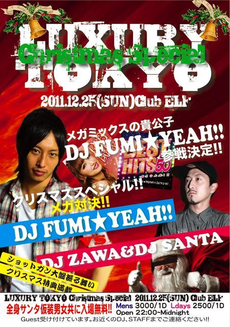 ELF X'mas Special 3DAYS最終日の25日は GUESTにDJ FUMI☆YEAH を迎えてお届けする、LUXURY TOKYO X'mas Special 全身サンタコスプレは男女共に終日フリー 女性は、ミニスカサンタで大集合 オールミックスでお届けする、X'mas最終夜 大盛り上がりの全館オープンでお送りします 25日はELFサンタより4つのプレゼント 映画『ニューイヤーズ・イブ』プレミアムペアチケットを6組様に