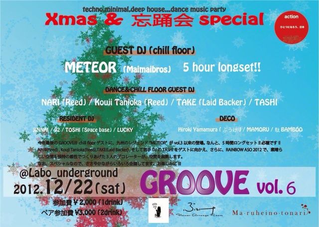DJ陣もPAINT IT BLACKのハジメくん、KollektivGrooveのAKAGIくん、期待の新人クロイワくん、ambienceの井上さん等、かなりオールジャンルな流れで出来そうです!!自分ももちろん、年末総決算ガッツリセットでSPINさせて貰います!