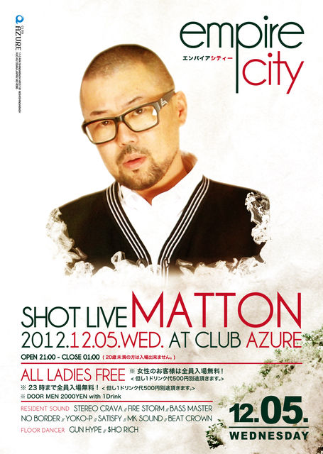 必ずID(身分証明書)をお持ちください 毎週水曜大人気“アンモナ”大人気REGGAE300人PARTY 大人気PARTYの“エンパイアシティ” ※※※緊急告知※※※ 12/5(水)のSHOT LIVEスペシャルは… MATTONが出演!!! やばいこと間違いなし!!! みんな要チェック!!! ※※※※※※※※※※ 21時から盛り上がるエンパイア それは何故かと言うと… 早い時間から人も入って盛り上がっているからです♪ ■21時−23時までの「アズ割」で… 男女共に入場無料 水曜は女性にも男性にもお得なエンパイアシテ