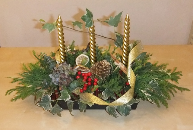 管理人様 イベントの告知失礼します。 Mark Floral Studioからお知らせです。 リース同様、この企画も例年ご好評をいただいています。 クリスマスらしいグリーンをベースにお花や小物で装飾します。 食卓やサイドボードに飾れるデザインです。 キャンドルを灯しながらクリスマスを待つのも又格別な味わい。 初心者向けのデザインです。 少人数制で丁寧にご指導いたします。 フラワースポンジ(オアシス)に挿していくだけで未経験の方でも見事な作品が完成します。 *なるべく新鮮で日持ちの良い品種の花やグリーンを用意しますが、