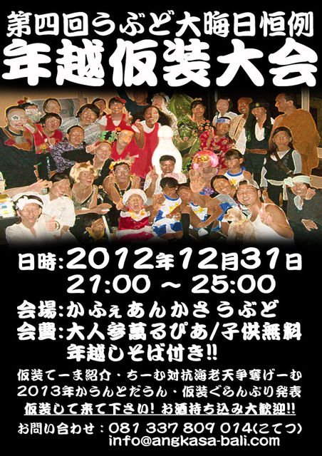今年もやってきました《うぶど大晦日恒例年越仮装大会》 こういう愉快なイベントが、今後何年も続くほど平和なウブドであることを願って開催。 自由参加です。在住者・ウブド熱愛症候群の旅行者を交えて一緒に楽しみましょう。 豪華景品のあるゲームも行います。 仮装グランプリは、参加者皆さんの投票で決まります。 賞品は、グランプリのビーチリゾート宿泊券ほか、たくさん用意しております。残すところ あと10日。しっかり準備して、グランプリを目指しましょう。 そして、2013年の新年を明るく迎えましょう。 (写真右:昨年度グランプリ