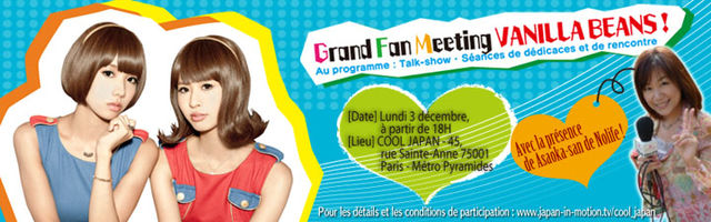 バニラビーンズファンミーティング開催! Le Fan Meeting des VANILLA BEANS aura lieu au magasin COOL JAPAN. 2012年12月3日 18時開場 18時半〜 19時半終了予定 クール·ジャパン - サンタンヌ通り45| 75001パリ 電話。01 42 60 20 85 cooljapan@orange.fr 月曜日 - 土曜日:11:00〜19:00〜12:00 / 12:30 http://www.cool-japan.eu/content/4-a-propos-cool-japan http://www.facebook.com/CoolJapanFrance/page_map http://maps.google.co.jp/maps?q=45+rue+Sainte-Anne+%7C+75001+Pari&sugexp=chrome,mod%3D11&um=1&ie=UT