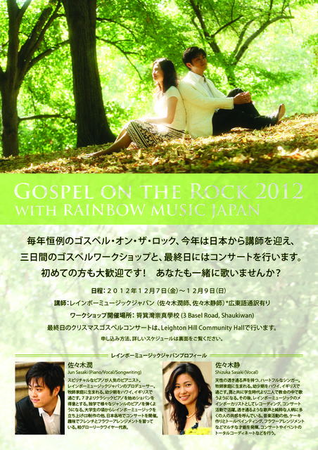 管理さん、この場を借りて、イベント告知させてください。 <<<Gospel On the rock>>> ゴスペルワークショップに参加しませんか? 日本から講師を迎え、三日間のゴスペルワークショップを行います。 最終日には、ワークショップで仕上がった曲をクリスマスコンサートで 発表します。 12月7日 ワークショップ 12月8日 ワークショップ 12月9日 クリスマスコンサート ワークショップ参加費:HKD250(一般)、HKD150(専業主婦、中学1年以上の学生)、HKD100(小学1年〜6年の子供)