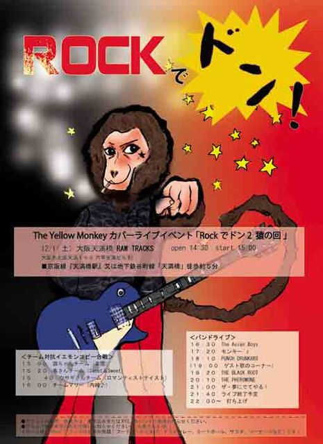 冬のRockでドン第二弾! ドンと開催致します☆ The Yellow Monkeyカバーライブイベント 「Rockでドン 2 猿の回 」 12/1(土)大阪天満橋 RAW TRACKS(http://www.rawtracks.jp/calendar/index.php?yyyy=2012&mm=12) 所在地 大阪市北区天満1-6-8 六甲天満ビルB1 ■京阪線『天満橋駅』又は地下鉄谷町線「天満橋」徒歩約5分(http://www.rawtracks.jp/home.html) open 14:30 start 15:00 チケット代 前売り/当日共に1500円(+1drink500円) ◆タイムテーブル <チーム対抗イエモンコピー合戦>