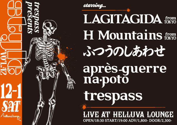 神戸のtrespassです。 今日は自主企画の宣伝をさせて下さい! 12/01(土)神戸HELLUVA LOUNGE trespass presents“Style”vol.42 open 18:30 start 19:00 adv \1800 door \2300 ●LAGITAGIDA(東京)(http://www.lagitagida.jp/) King Crimson,Led Zeppelin,Jimi Hendrix等を彷彿とさせるギターサウンドを、ポスト・ハードコア以降の感性で独自に消化するインストゥルメンタル・ロックバンド! 超絶テクニックに裏打ちされたライブパフォーマンスは必見です! ●H Mountains(東京)(http://hmountains.tumblr.com/) ボーカル畠