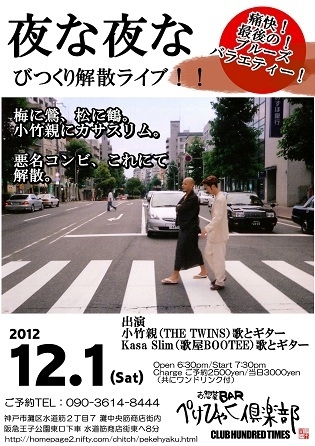 ■2012年12月1日(土)【夜な夜なびつくり解散ライブ!!】 双子のアコースティック・ソウルデュオのTHE TWINSの小竹親と 昭和歌謡ブルーズデュオの歌屋BOOTEEのカサスリムがお送りする 痛快!最後の?!ブルーズバラエティーライブ! 映画「悪名」をパロッた笑いあり、涙ありのブルーズライブです♪ 梅に鶯、松に鶴。 小竹親にカサスリム。 悪名コンビ、これにて解散。 是非是非お越し下さい♪ お早めのご予約を!! 夜な夜なびつくり解散ライブ!! ■出演:小竹親(THE TWINS)歌とギター&Kasa Slim(歌屋BOOTEE)歌とギ