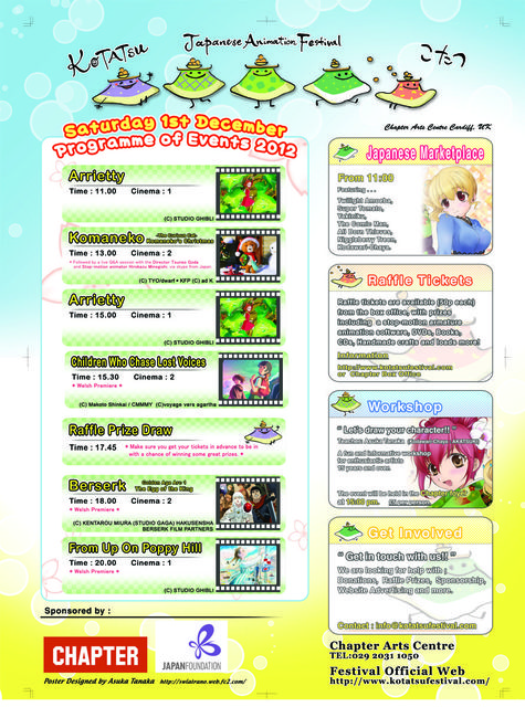 今年のこたつ映画祭のプログラムのお知らせです。 12月1日(土) 会場:チャプター・アーツ・センター 11時〜終日 マーケットプレイス 11時〜「借りぐらしのアリエッティ」 13時〜「こまねこ/こまねこのクリスマス」 スカイプで合田経郎監督と峰岸裕和アニメーターとのQ&Aを開催します。 15時〜「借りぐらしのアリエッティ」 15時〜 漫画ワークショップ "Let's draw your character!" 講師:田中明日香 料金:5ポンド 15時半〜「星を追う子ども」 17時45分 ラッフルくじ抽選 18時〜「ベルセルク