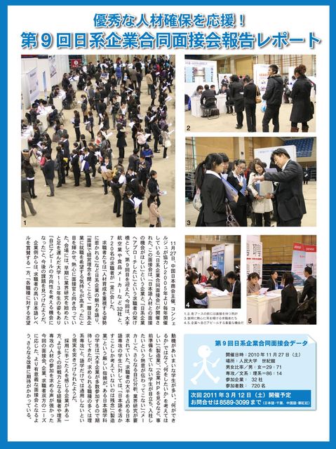平素お世話になっております。私、コンシェルジュの千葉と申します。 きたる12月1日(土)に、中国日本商会主催、コンシェルジュ運営の もとに第13回日系企業合同面接会を新世紀日航飯店にて開催いたします。 ただ今、学生の参加申し込みを受け付けております。 過去数多くの日系企業が参加しており、今年も約30社の参加 が予定されております。参加企業の特徴といたしましては、 今後中国にて発展が期待されるサービス業や、日本で上場している 企業。 また、理工系の学生の参加をねらって、製薬会社や自動車関連の 会