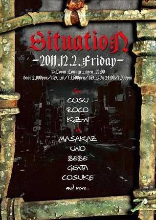 管理人様、告知失礼致します。 不適切な場合、お手数ですが消去願います。 千葉LOOM LOUNGE(旧BELT)にて開催されているSITUATION!!! 最新の新譜はもちろん、幅広い選曲で毎回フロアは大盛り上がりで泥酔者続出♪ 出演者は、好評発売中【Mr.OMERI&DJ MASAKAZ 2008~2011 unrelease ALBUM"Not forgiven?"】をリリースしたDJ MASAKAZを筆頭に、千葉で活躍中のアーティストがフロアを熱くします! LIVE、DJ、それぞれが良い雰囲気をつくり、CLUBに行くのが初めての人やCLUB常連の方までどんな人でも楽しめるパーティーになること