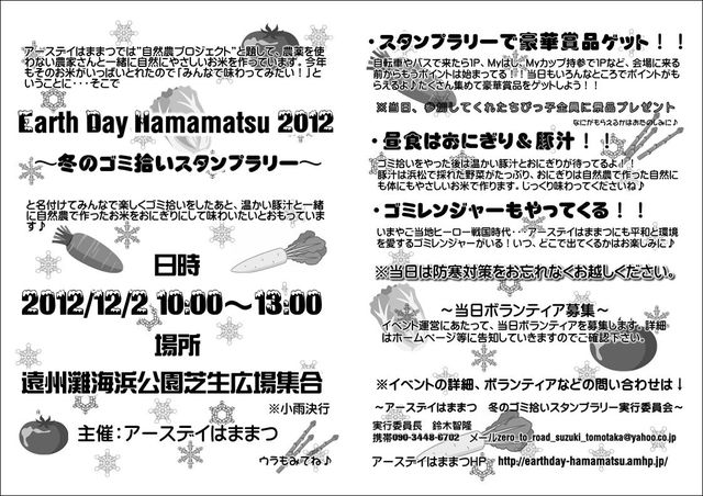 みんなで楽しく地球をキレイにしよう 12/2(日)に、ゴミ拾いイベントを開催いたします。 それでは、イベントの紹介をさせていただきます。 ポイント集めて豪華賞品GET 今回のイベントでは、様々な方法でポイントを集めていただき、たくさん集めた方には景品をGETすることができます。景品も数種類用意していますので少ないポイントでも景品を用意してあります。 昼食には、自然農で作ったおにぎり&地元で採れた野菜の豚汁を振る舞います。 ゴミ拾いをして下さった方全員に、昼食を用意させていただきます。おにぎりに