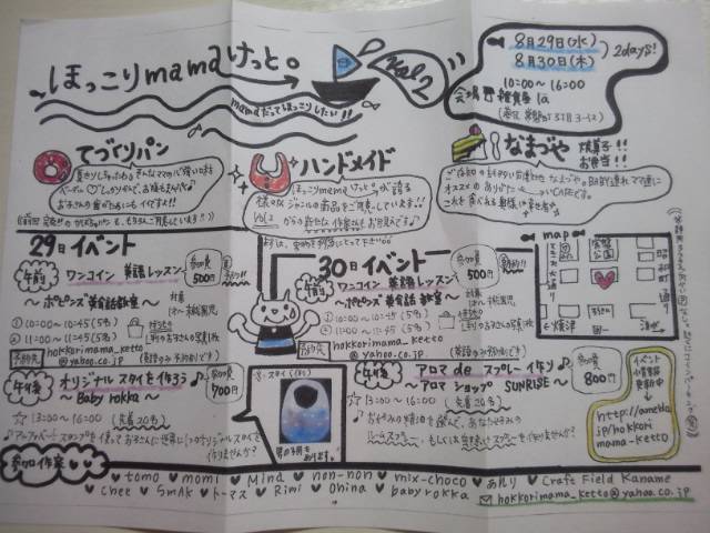 ほっこりmama-けっと。vol.2 日頃何かと忙しいママ達に少しでもほっこりして欲しい!! そんな想いからできたイベントです 時間:10時〜15時 会場:静岡市葵区常磐町3−3−12 雑貨屋らー (駐車場はありません。近くのコインパーキング を御利用ください。) 地図→http://maps.loco.yahoo.co.jp/maps?p=%E9%9D%99%E5%B2%A1%E5%B8%82%E8%91%B5%E5%8C%BA%E5%B8%B8%E7%A3%90%E7%94%BA%EF%BC%93%E4%B8%81%E7%9B%AE%EF%BC%93%EF%BC%8D%EF%BC%91%EF%BC%92&lat=34.96939601&lon=138.38138174&ei=utf-8&v=2&sc=3&datum=wgs&gov=221