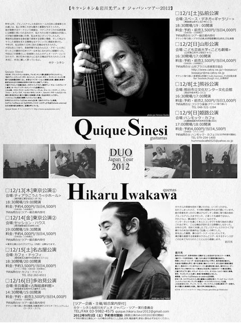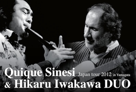 アルゼンチンを代表するギタリスト:キケ・シネシと、若き気鋭のケーナ奏者:岩川光の、フォルクローレ/ジャズを超越したスーパー・デュオ! キケ・シネシ:7弦ギター、ピッコロギター、チャランゴ ほか 岩川 光 : ケーナ、サンポーニャ、リコーダー 日時:2012年12月2日(日)、16時半開場、17時開演 場所:こども芸術大学「こども劇場」(山形市上桜田3-4-5) 料金:前売り 3,500円/当日 4,000円 <全席自由> 主催:キケ・シネシ&岩川光デュオ ジャパン・ツアー実行委員会 共催:山形ブラジル音楽普及協会 後援:山形新聞・山