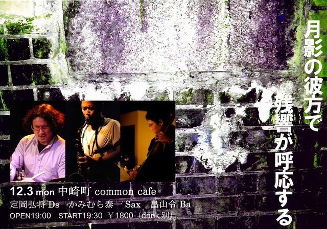 告知失礼します。 『月影の彼方で残響が呼応する』 2012.12/3(月) 19:00open 19:30start ¥1800(ドリンク別) 出演: 定岡弘将 drums http://undermine.seesaa.net/ かみむら泰一 saxophone, effects http://www.taisax.com/taiichi.html 畠山令 wood bass http://www.ryohatakeyama.com/ 会場: 中崎町common cafe(コモンカフェ) http://www.talkin-about.com/cafe/map.html 大阪市北区中崎西1-1-6 吉村ビルB1F ※地下鉄谷町線中崎町駅4番出口を上がったところでまわれ右して直進、 パーキングを越えてすぐ左