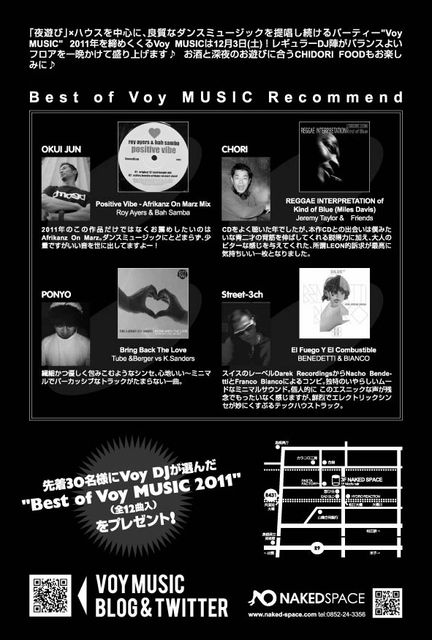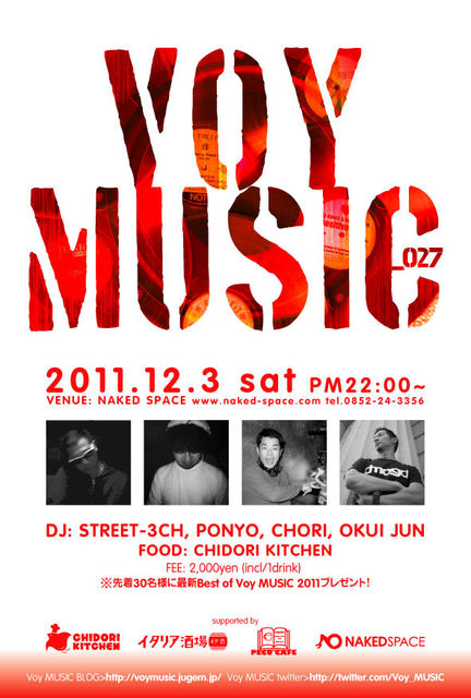 「夜遊び」×「ダンスミュージック」 ハウスを中心に、良質なダンスミュージックを提唱し続ける老舗パーティー"Voy MUSIC" 2011年を締めくくるVoy MUSICは12月3日(土)!レギュラーDJ陣がバランスよいフロアを一晩かけて盛り上げます♪ お酒と深夜のお遊びに合うCHIDORI FOODもお楽しみに 2011.12.03.Sat.PM10:00〜 [ Voy MUSIC_027 ] ♪HOUSE/DANCE MUSIC DJ: STREET-3CH, PONYO, CHORI, OKUI JUN FOOD: CHIDORI KITCHEN FEE: ¥2000(incl/1drink) ※ 当日先着30 名様にVoy DJが選んだBest of Voy MUSIC 2011(全10曲入)をプレゼン