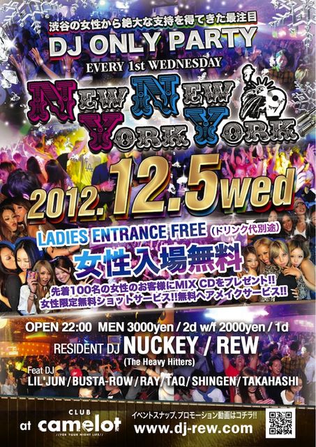 12.5(水)渋谷camelot女性入場無料!!毎回満員御礼の鉄板DJ ONLY HIPHOP PARTY"NEW YORK NEW YORK"