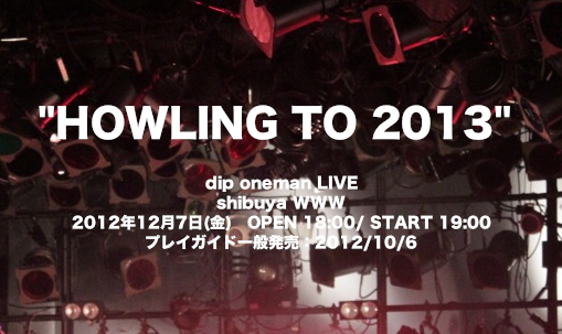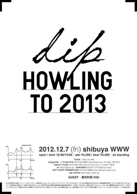 日時:2012年12月7日(金) OPEN 18:00/ START 19:00 会場:shibuya WWW 料金:3,500yen (税込・1Drink別)ALL STANDING 出演:dip (ワンマン) ゲスト:豊田利晃(映像)、クジヒロコ(synth) プレイガイド:発売中 チケットぴあ Pコード:180-873 ローソンチケット Lコード:71928 イープラス http://eplus.jp/ GAN-BAN 03-3477-5701http://ganban.net/ 主催:HOT STUFF PROMOTION 企画・制作:dip / UK. PROJECT / Doobie INFO:Doobie/ HOT STUFF PROMOTION(Tel:03-5720-9999)