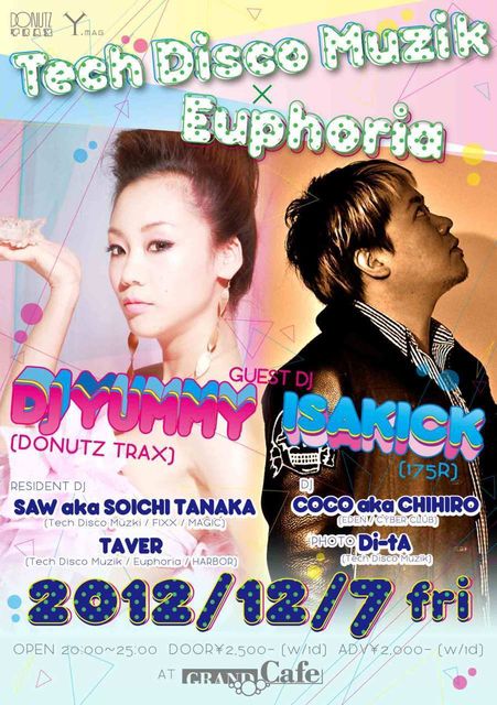 175RのベーシストISAKICKがDJとして来阪 プログレッシブHOUSE〜Electro House〜ROCKを軸にしたDJだそうです。 http://iflyer.tv/artist/25689/ISAKICK/ DJとしてのISAKIさん乞うご期待!! ダブルゲストのもう一人はグランカフェ初登場となる人気実力共に兼ね備えた名実ともに女性No1 Djに君臨するYUMMYです。 この最高のコラボレーションでHOUSE MUSIC好き〜クラブ初心者までみんなが楽しめるパーティーです。 日程 : 2012年 12月7日 (金) 場所 : Grand Cafe Osaka大阪府大阪市中央区西心斎橋2-10-21 スパジオビルB1