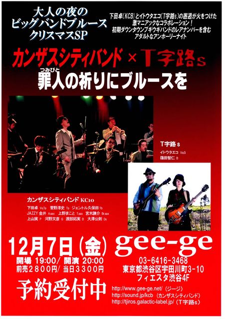 カンザスシティバンド KC10×T字路s 下田卓(KCB)とイトウタエコ(T字路s)の邂逅が火をつけた激マニアックなコラボレーション! 初期ダウンタウンブギウギバンドのレアナンバーを含むアダルトなアンホーリーナイト! 場所 渋谷gee−ge (03−6416−3468) 開場19:00 開演20:00 前売り2,800円 当日3,300円 年内最後のKC10ライブです! お見逃しなく!!! http://www.gee-ge.net/ (gee-ge) http://sound.jp/kcb/ (カンザスシティバンド) http://tjiros.galactic-