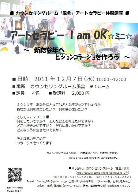 アートセラピー I am OK ☆ミニ☆ 〜 新たな年へ ビジョンコラージュをつくろう 2011年もあと少し 社会的にどんな年であったかを語ることは、ここではよしておきましょう あなたにとってはどんな年だったでしょうか あなたは何を見ましたか? 何を感じましたか? そして。。。2012年 なにをしたいですか? どんなことを叶えたいですか? どこへ行きたいですか? だれに逢いたいですか? どんなふうに生きたいですか?
