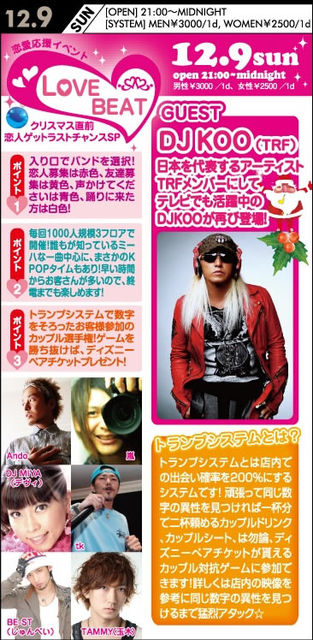 エントランスで五十嵐ゲストのミクシーと言ってもディスカウントになります 【特別ディスカウント価格】男性2000/1D、女性1500/1Dでご招待します 超話題の恋愛応援イベントLOVE BEAT 毎回参加者1000人を超え、豪華ゲストやサプライズもありお騒がせなこのイベント 今回は日本を代表するアーティストのTRFメンバーでテレビでも活躍中のDJ KOOが登場 ツイッター(フォローしてね) https://twitter.com/#!/lovebeat_kitene ラブビートブログ(写真も載っています) http://ameblo.jp/lo