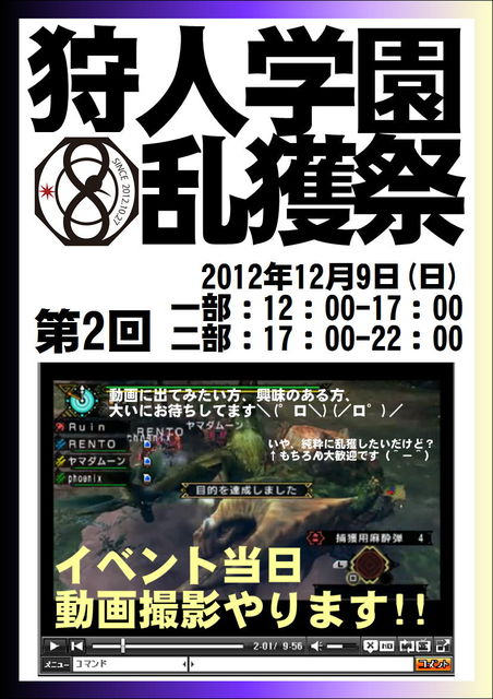 久々にイベントトピックたてさせてもらえます(笑)、学園長です。 全モンスター100頭狩、1000頭狩、トータル10000頭… 『勲章コンプまではチュートリアル』 最近この言葉の意味がやっと実感できてきました。 そんな終わりなき道を歩む狩人に狩学からの恒例イベント! 乱 獲 祭 この『乱獲祭』というタイトルも浸透してきたようで、 他の集会所でもこのタイトルを使ってくれた場所があるそうで嬉しい限りです。 乱獲祭本家の威信にかけて今まで以上に質の高いイベントにしていきたいと思っております。