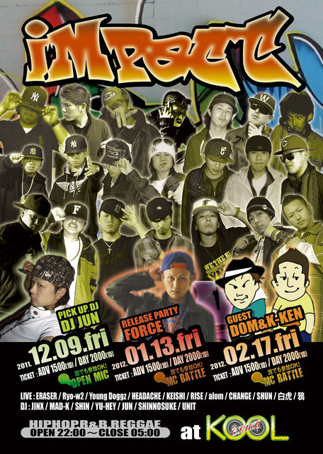 告知失礼します。 大盛況で幕を閉じた前回の「IMPACT」1TH ANNIVERSARY!! これまで若手をCONCEPTに行われていた「IMPACT」であるが心機一転! 次世代のHIPHOP SCENEの中核となるであろうMC陣DJ陣が出演!! EVENTの目玉でもあるOPEN MICもさらに進化し2012.1.13[Fri]から「MC BATTLE」の開催が決定!!ENTRANCE料金のみで参戦可能!!(無論豪華賞品有り!!) 更に毎月のPICK UP GUESTに要CHECK!!! ここに次なる2THに向けてまた新たなSTARTが切って落とされる!! 「IMPACT」 2011.12.9.[Fri] @CLUB KOOL(LIVE HOUSE KENT) OPEN 22:00 HIPH
