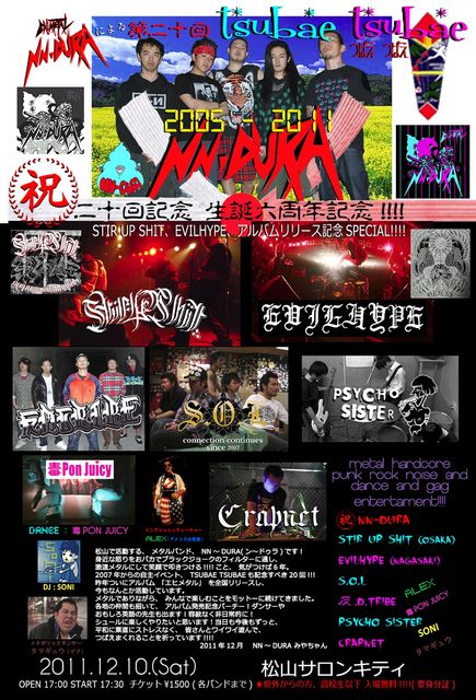松山で活動するハードコア・メタルバンド、NN〜DURAです。 ライブ告知失礼いたします。 2011年12月10日(土) @松山サロンキティ 前売り 1500円 NN〜DURAによる第20回 TSUBAE TSUBAE 祝!20回記念、NN〜DURA生誕6周年記念、 STIR UP SHIT、EVILHYPE、アルバムリリース記念SPECIAL!!!! OPEN 17:00 START 17:30 予定 ■NN〜DURA ■STIR UP SHIT(大阪) ■EVILHYPE(長崎) ■S.O.L ■反D TRIBE ■PSYCHO SISTER ■CRAPNET DJ ■SONI ■MICCHY DANCE ■毒PON JUICY ■メタボリックダンサー タマギュ