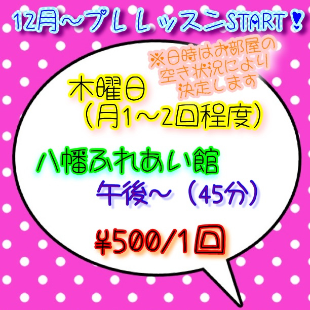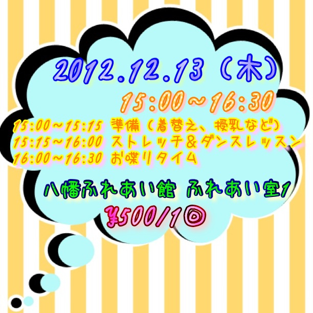 ■日時 2012/12/13(木)15じ〜 ■場所 八幡ふれあい館 (本八幡駅 徒歩8分 コルトンプラザ徒歩2分) ■参加費 \500 ■講師 Hiroyo ★来年から本格的にスタートするクラスのプレレッスンを開催します!! 産後に効く、気持ち良いゆったりストレッチと 赤ちゃんを抱っこやおんぶしたまま出来る、簡単(Eazy)なステップをして 楽しい(Enjoy)曲に合わせて踊ります。 (=EEダンス) ママ達の素敵なリフレッシュの時間を提供します♪ 初めの15分 で赤ちゃんのお世話など