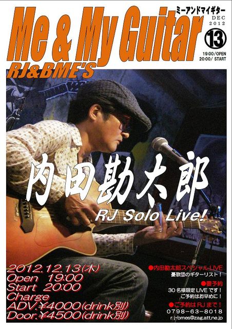 管理人様!告知で失礼します! 兵庫県西宮市のライブハウス&キッチンバー RJ&BME’Sと申します! 明日 2012・12・13(木) RJにて 内田勘太郎さんのソロLIVEが開催されます! まだ残席ございますので ぜひぜひご予約お待ちしております! 内田勘太郎ソロLIVE! "Me & My Guitar" 出演:内田勘太郎 ご予約はRJ、またはmixiのメッセージまで! RJ&BME’S rj-bmes@zag.att.ne.jp 0798638018 2012.12.13(木) 19:00/OPEN 20:00/START チャージ 前売り¥4000(ド