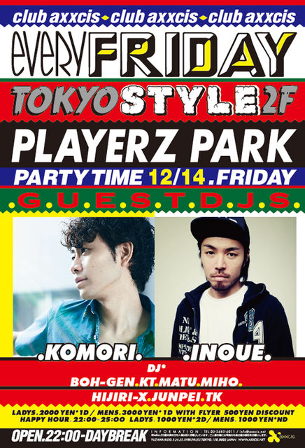 12/14(金) PLAYERZ PARK@渋谷axxcis 2F-4Fの3フロア開放の1000人規模BIG PARTY!! 1時まで、 飲み物が全て300円 18歳から入場可 第二週目の今回は 2F GUEST DJには DJ KOMORI DJ INOUE 3F GUEST DJには DJ SWING を迎え毎月1000人近く動員し金曜1番の盛り上がりをみせています 更に今回は3FにDJ HASEBEも出演!! この超豪華ゲスト4名を見られるのはこのPARTYだけです!! 確実にこの日1番盛り上がります ☆ゲスト入場方法です☆ ゲストで